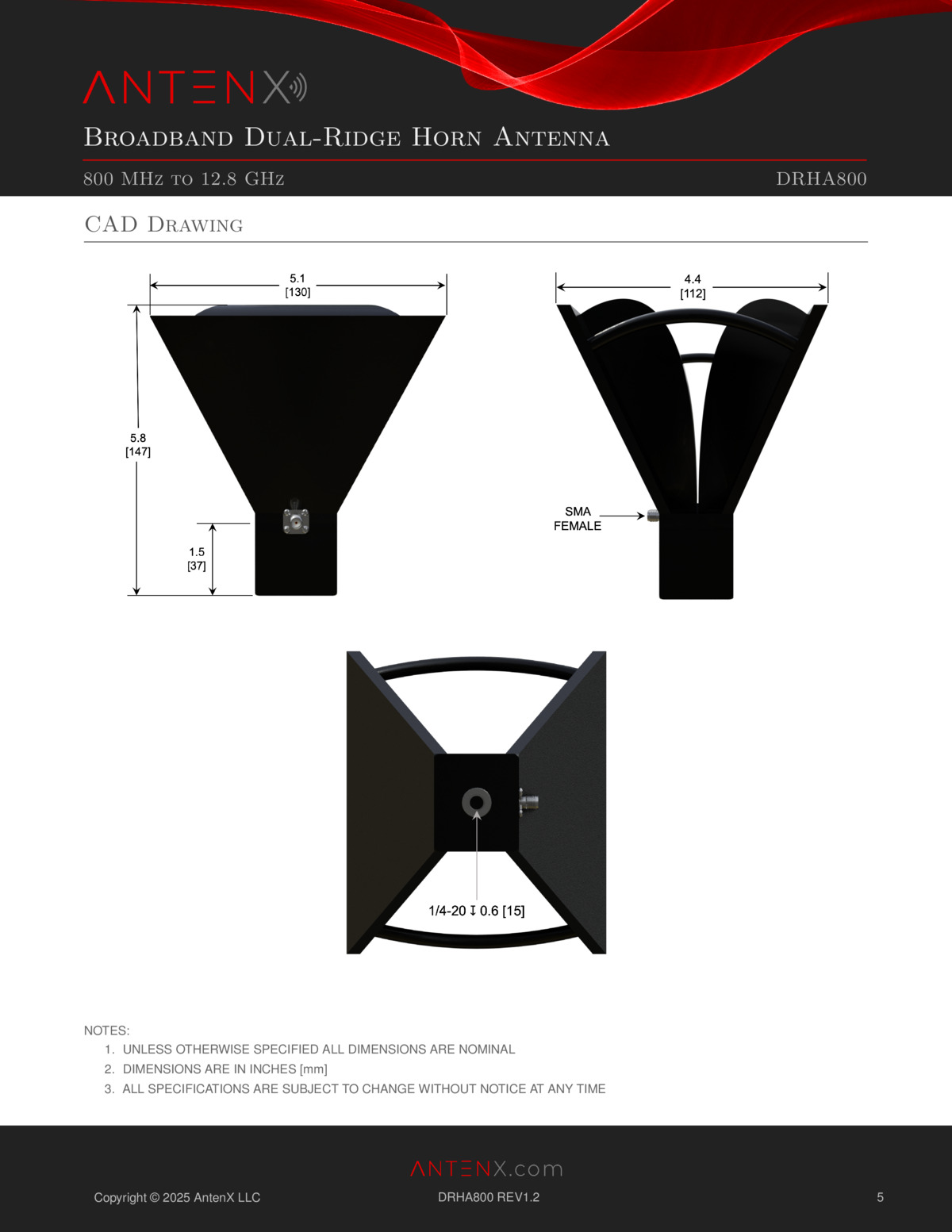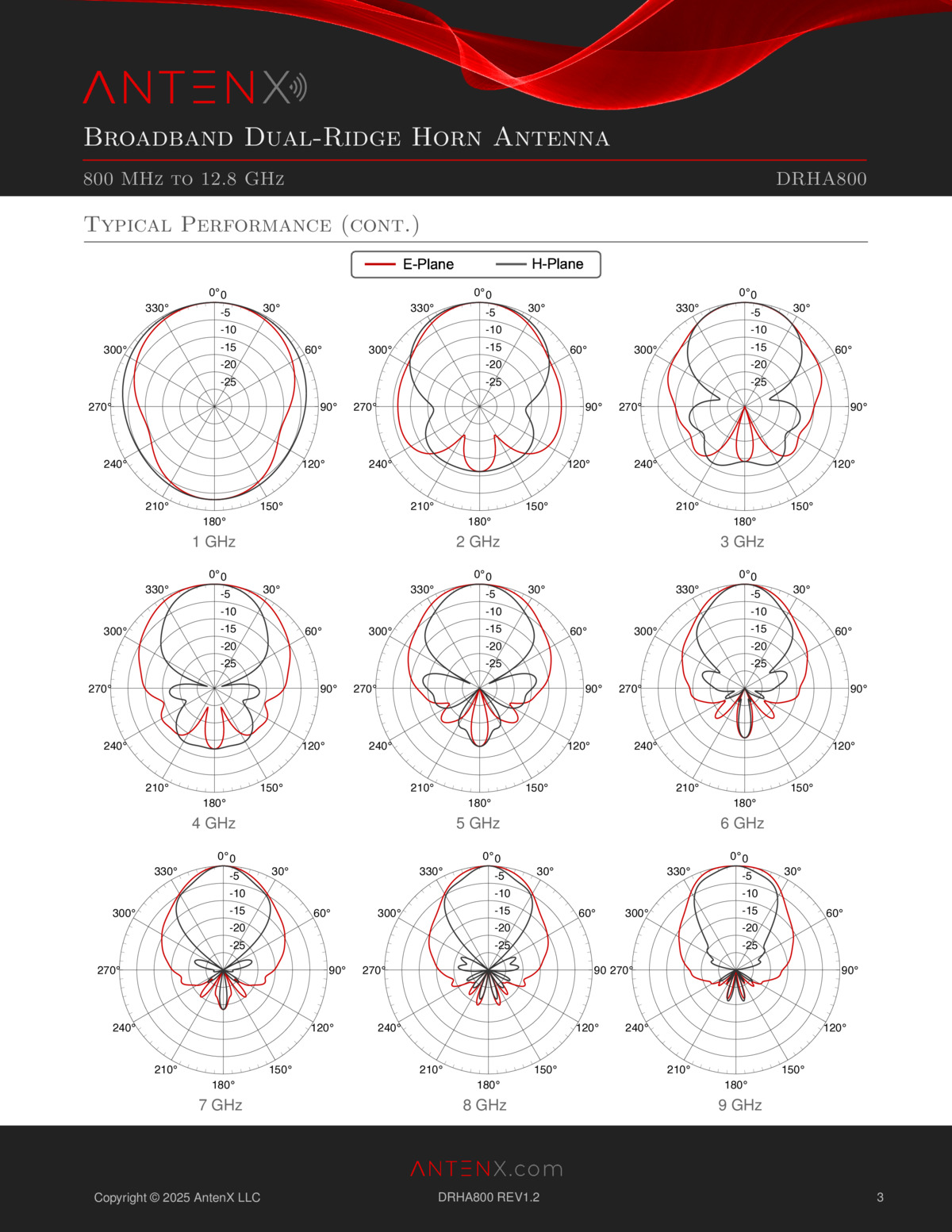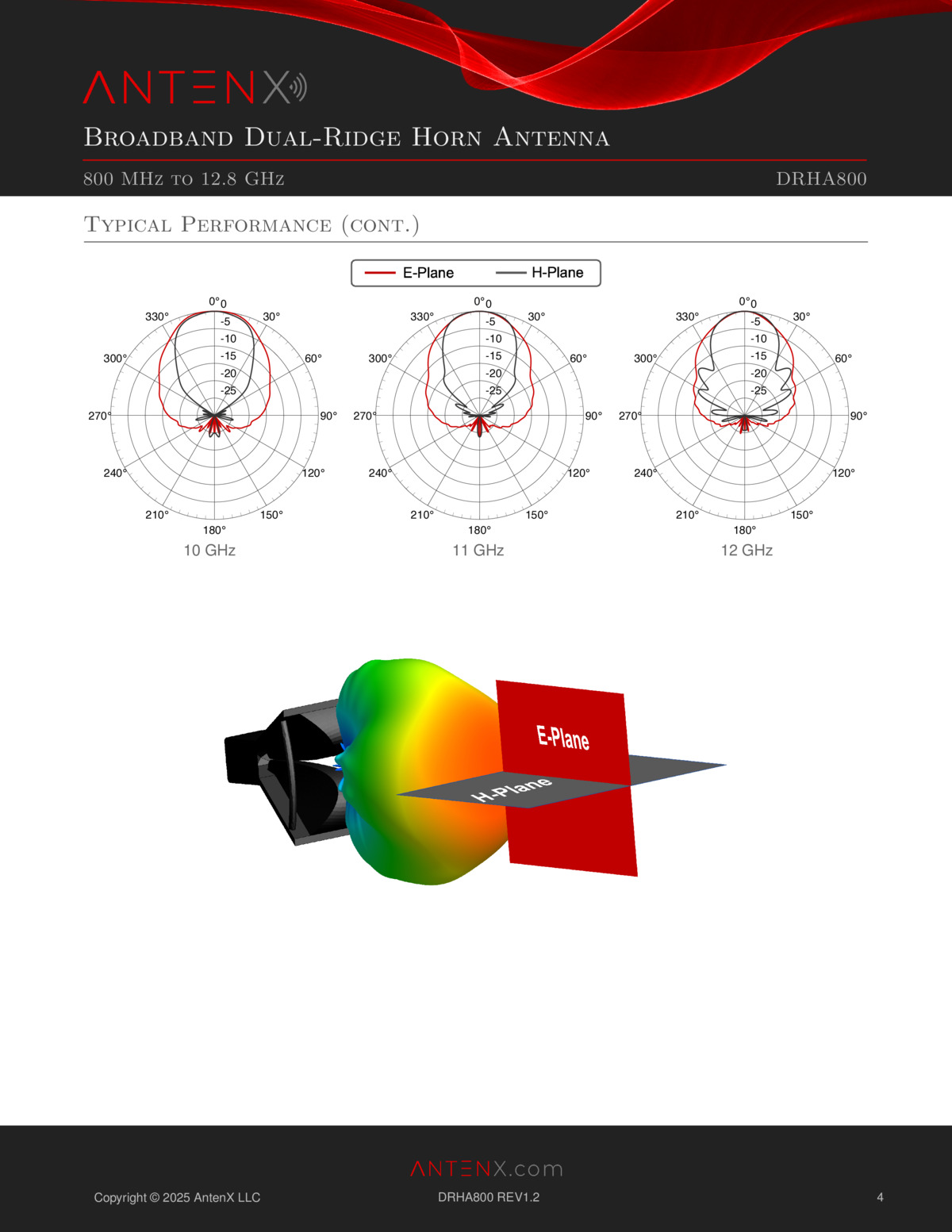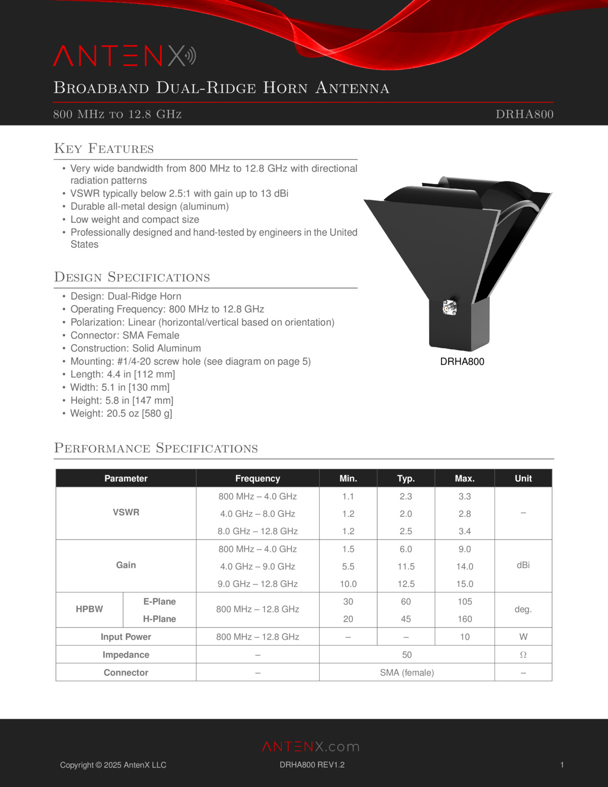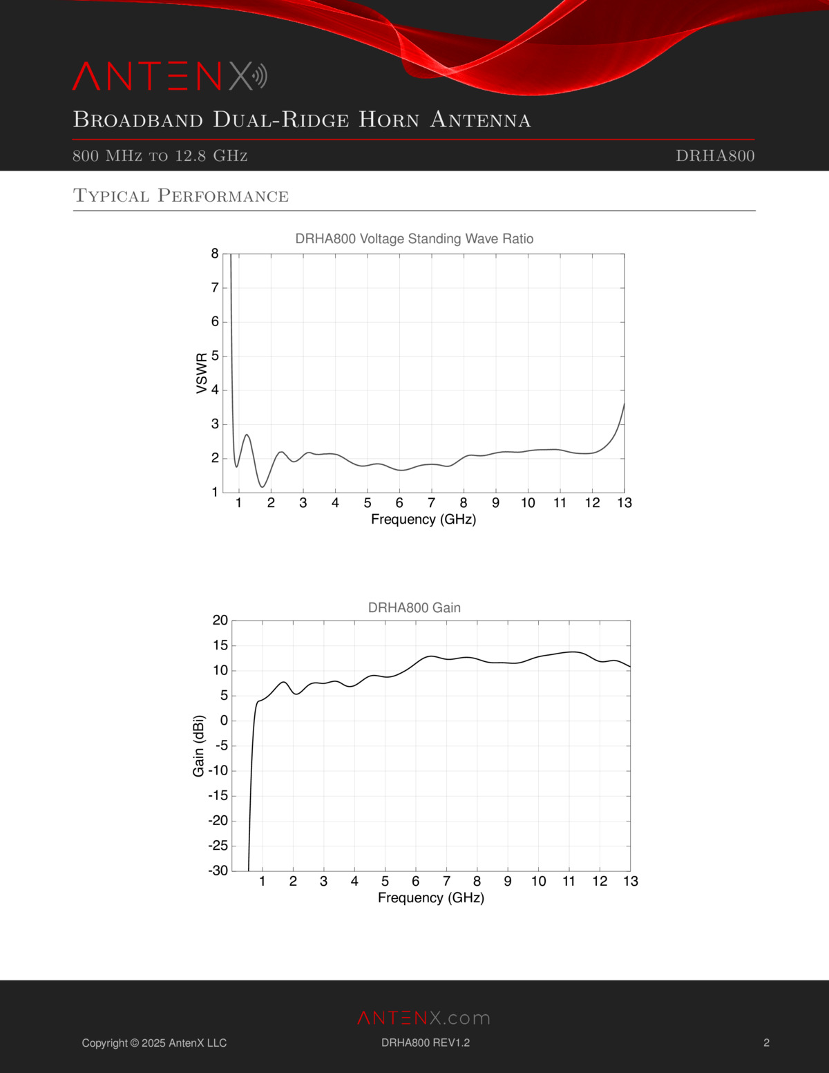 - Each DRHA800 comes with a Test Report showing the measured VSWR and boresight gain from 800 MHz to 12.8 GHz